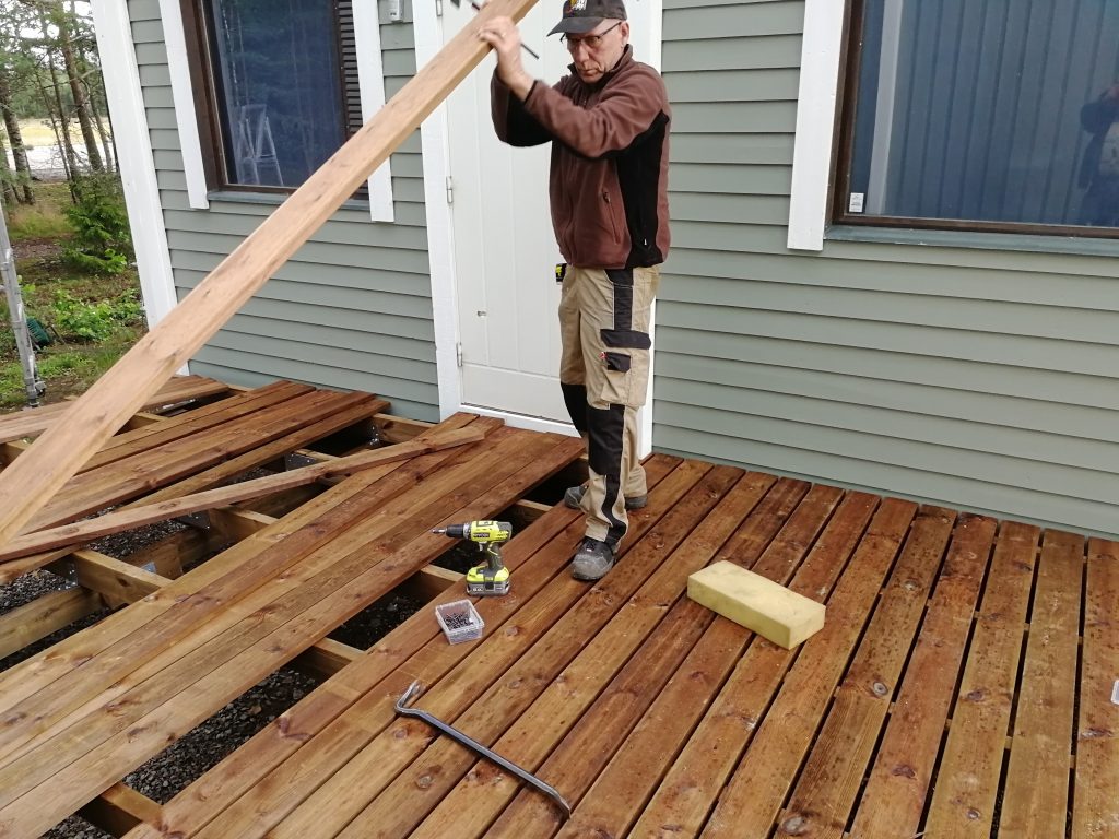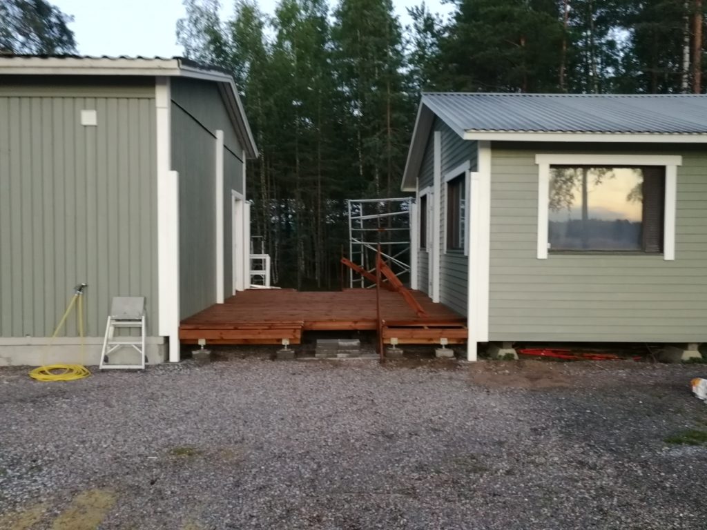 Iltahämärän laskeutuessa terassin lattia oli jo lähes valmis. Vielä muutamia kymmeniä ruuveja uupuu. Sitten portaat ja kaiteet kuntoon, niin päästään katon kimppuun. Hommaa pyritään jatkamaan valmiiksi saakka mahdollisimman pian.